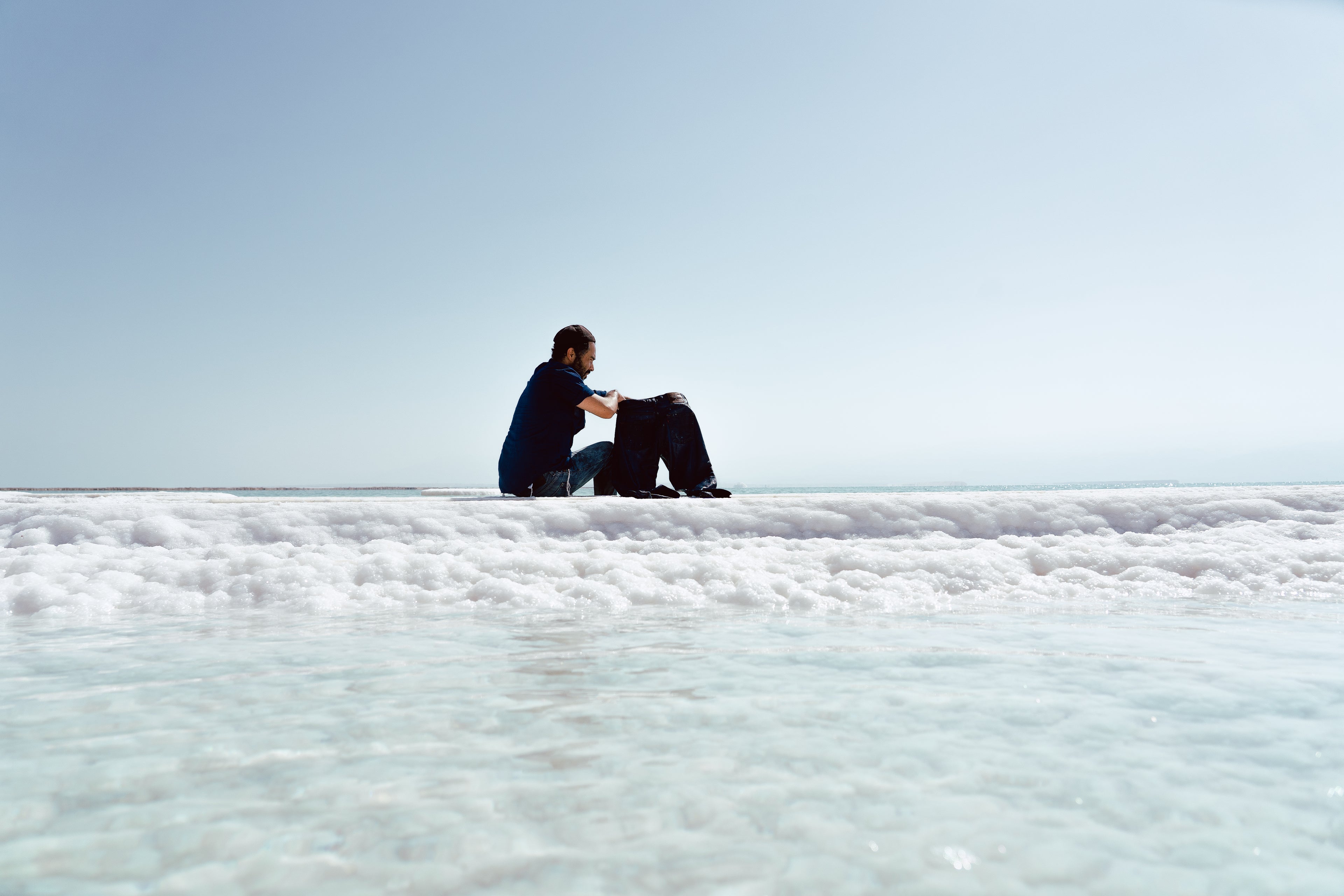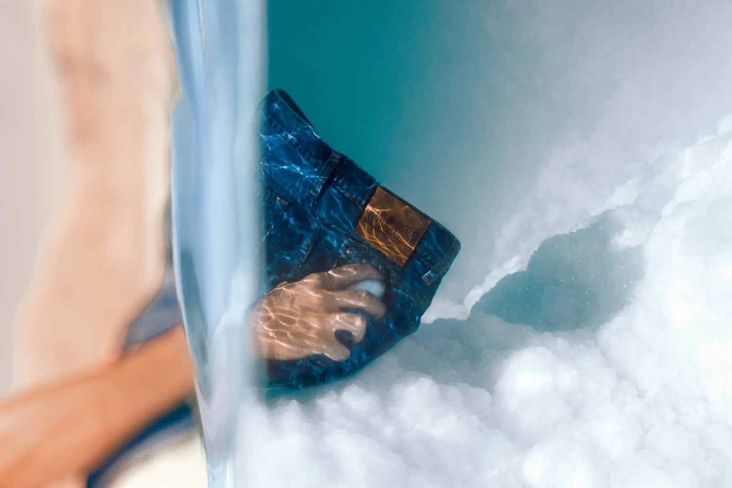 "It is in the Dead Sea, in the deepest place on the planet at -430m below sea level, that each piece of denim is treated in an eco-responsible way with abrasive salt crystals. The sunlight and the satt allow the deep indigo original colour to to fade into various tones of cobalt blue, green water, turquoise."